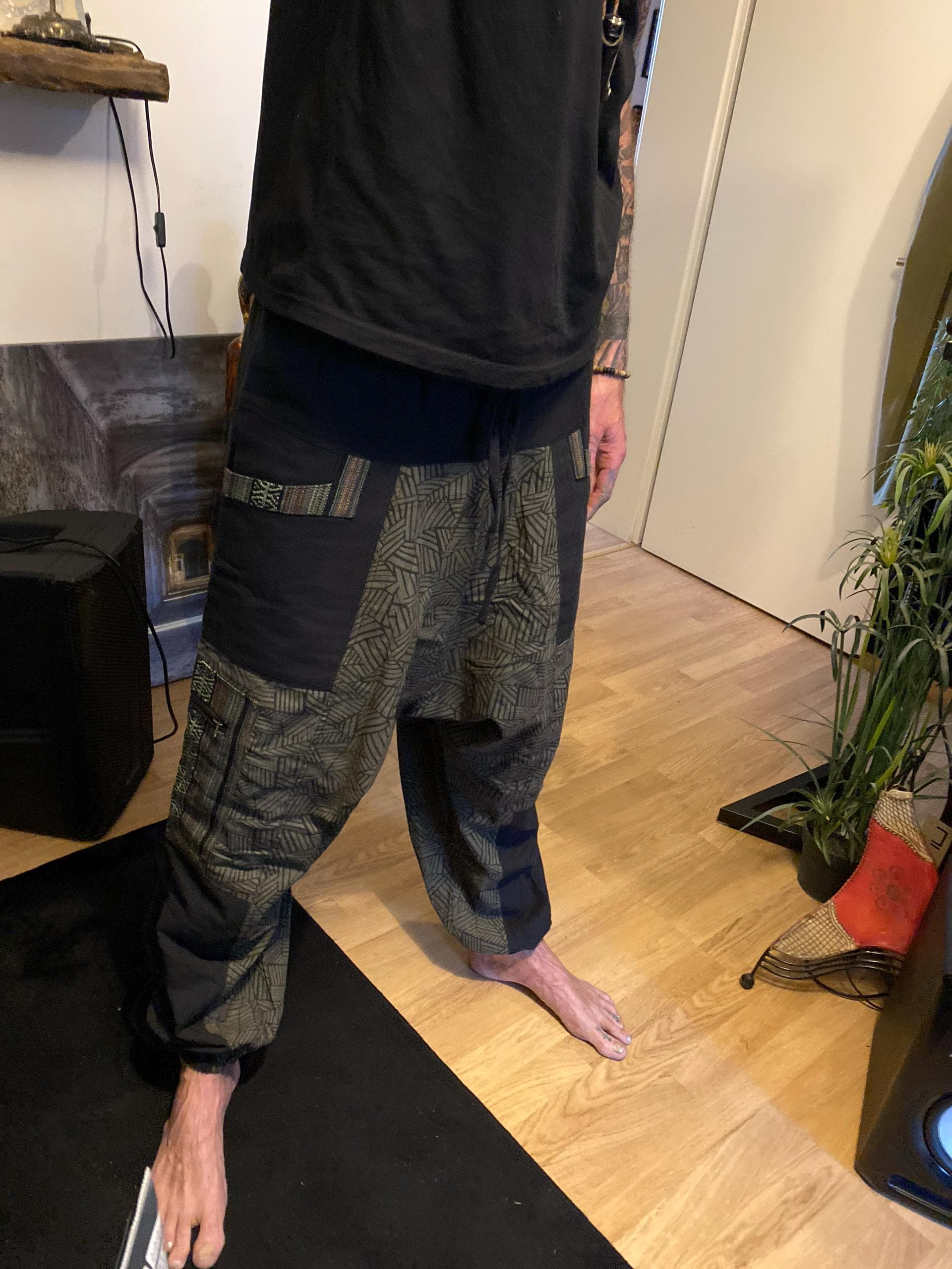 Heavyweight Afghani pants in natural colors made from various, partially printed cotton fabrics. Mid-rise crotch.